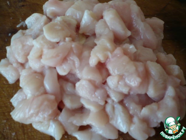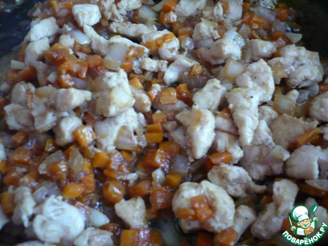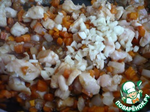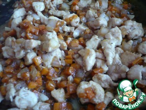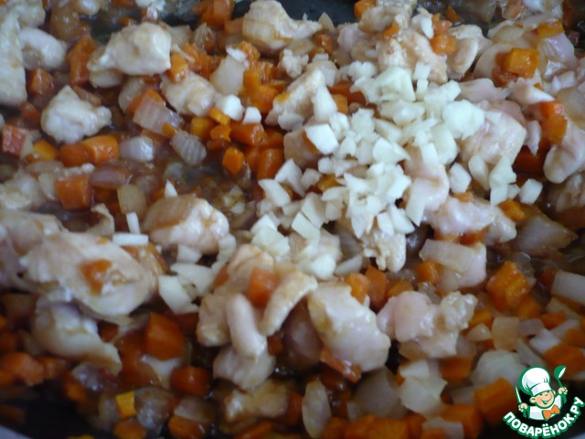 Добавляем нарезанное куриное филе и чеснок. Перчим по вкусу.
