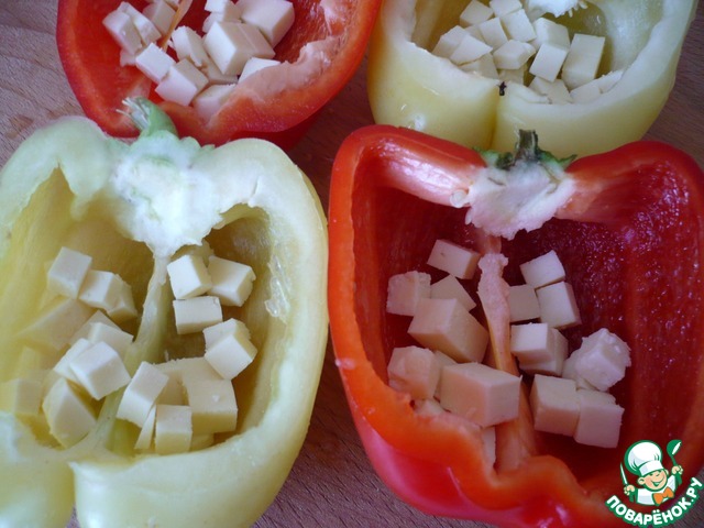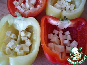 Выкладываем в половинки болгарского перца, адыгейский сыр нарезанный небольшими кубиками.
