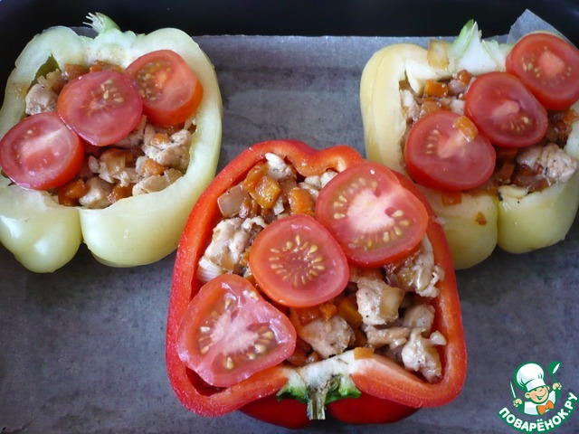 На начинку выкладываем помидоры черри, нарезанные тонкими кружочками (они не только дадут дополнительный вкус готовому блюду, но и помогут начинке остаться сочной после запекания перцев). Выкладываем перцы в глубокий противень, застеленный слегка смазанной растительным маслом бумагой для выпечки. Ставим противень с перцами в разогретую до 180 градусов духовку примерно на 35-40 минут, (в зависимости от того, как работает ваша духовка).