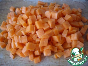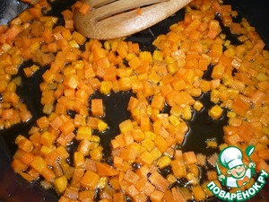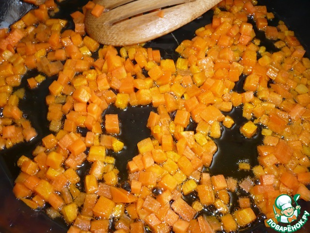 Как только морковь слегка начала обжариваться и потеряла свою первоначальную твердость — выкладываем в сковороду к моркови нарезанный мелким кубиком лук.