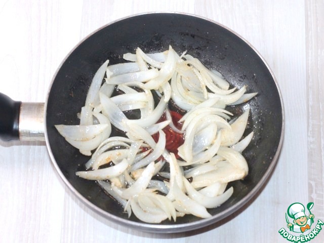 9. Приготовим чесночный соус. В теплой воде растворить бульонный кубик. Добавить прессованный чеснок, томатную пасту, сметану, щепотку сахара, перца и соли. Взбить венчиком.