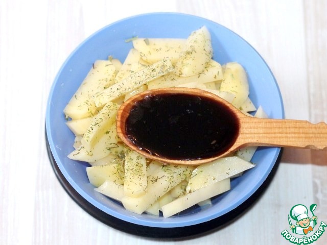 4. Подготовим овощи. Очищенный картофель нарезаем соломкой. Добавляем соевый соус, растительное масло и соль.