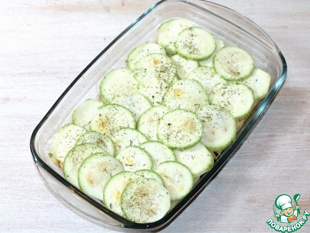 6. Кабачок моем, отрезаем плодоножку и огрубевшую мякоть с верхушки, нарезаем тонкими кружочками. Выкладываем кружочки кабачка на картофель, посыпаем щепоткой сухого чеснока, укропа и добавляем соль.