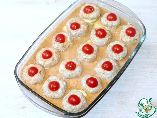 8. Макаем фрикадельки в белок, обваливаем в муке и выкладываем на кабачки. На фрикадельки кладем половинки помидорчика черри. Небольшим нажатием, "утопим" помидорчики.