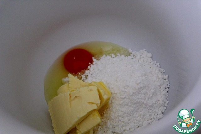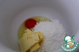 Вбить яйцо, добавить сахарную пудру и масло (или маргарин) комнатной температуры