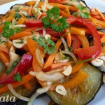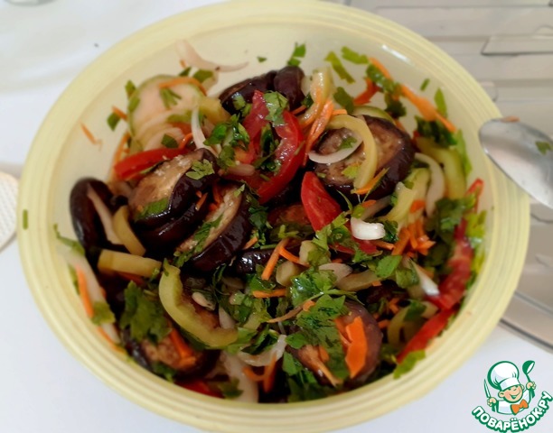 Баклажаны -чеснок - перец -лук - морковь -нарезанную зелень.