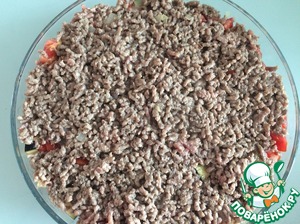 Фарш обжарить на растительном масле до полуготовности, добавив соль и перец, выложить на овощи.