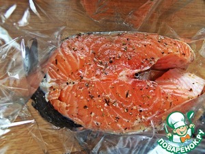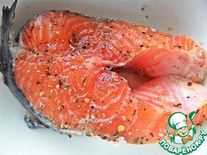 Лосось можно замариновать заранее, обваляв в соли, лимонном перце и ароматных травах и держать в холодильнике под плёнкой.