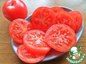 Теперь готовим нежные томаты. Нужны плотные, которые хорошо делятся на кружочки, не мнутся.