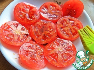 Смазать кисточкой сковороду-гриль, хорошо прогреть её. Перенести в неё томаты и не двигать до зажаривания.