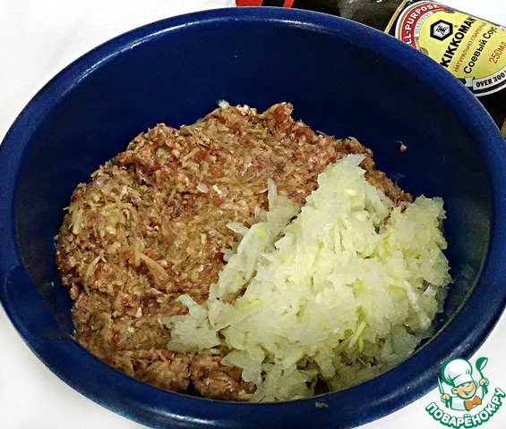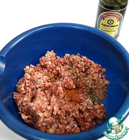 В фарш добавить все специи, приправы и соевый соус ТМ Kikkoman, который придает блюду насыщенный вкус. -