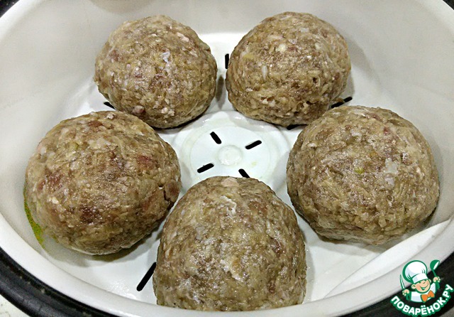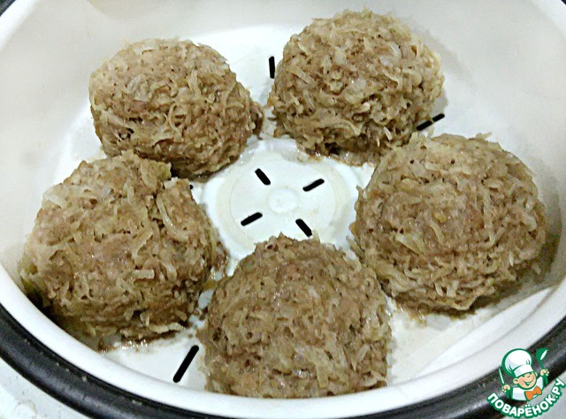 В чашу мультиварки налить 1,5л воды (у меня объем 2,5л). Дно пароварки обмазать растительным маслом (чтоб наши шарики не прилипли). Распределить шарики в пароварку, закрыть крышкой и установить режим "Варка на пару" 40 минут. Ориентируйтесь по своей мультиварке, т. к. мощность каждой разная. -