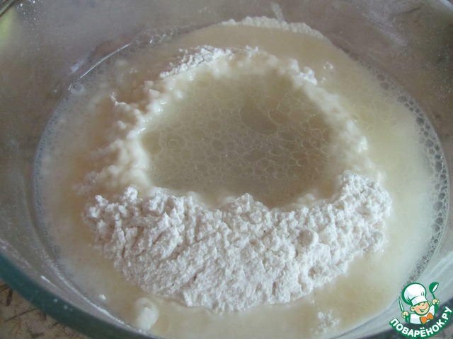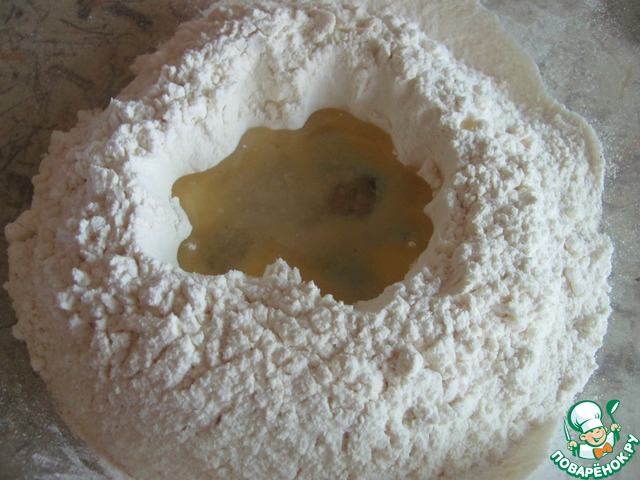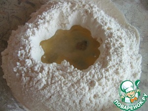 Просеять муку, сделать в ней воронку. Влить масло и насыпать соль.