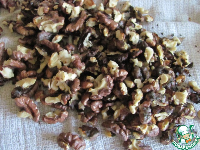 Пока тесто отдыхает приготовим начинку. Орехи подсушить на сухой сковороде, высыпать в полотенце, накрыть, потереть, чтобы снялась корочка. Если нужно, то некоторые места очистить руками. Этот шаг вполне можно и пропустить.