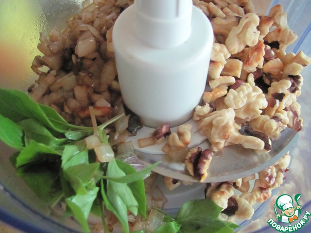 Лук с грибами переложить в кухонный процессор или любой другой измельчитель. Добавить орехи. Базилик помыть, просушить. Оборвать листики и добавить в процессор.