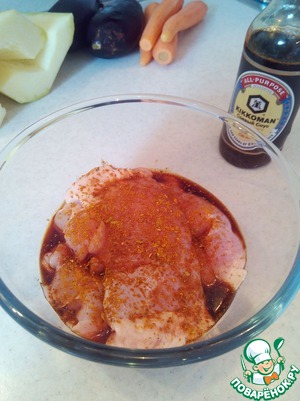 • Куриное филе (у меня филе бедра) замариновать в соевом соусе ТМ Kikkoman, добавив по желанию любимые специи. Досаливать не надо