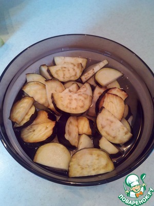 • Баклажаны нарезать на небольшие кусочки и поместить в миску с подсоленной водой минут на 10 (чтобы убрать горечь), затем воду слить