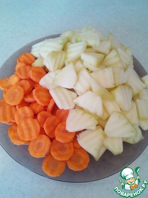 • Кабачок очистить от кожуры, нарезать на небольшие кусочки, морковь нарезать кружочками