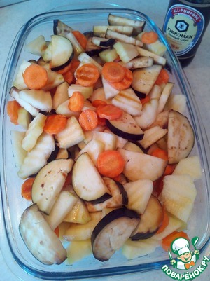 • Смешать баклажаны, кабачок и морковь, переложить в форму для запекания, сбрызнуть соевым соусом ТМ Kikkoman.