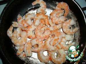 Вынуть креветки из воды, очистить, сложить в сковороду, заранее смазанную растительным маслом. Обжарить в течение 3-5 минут.