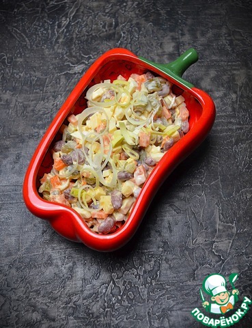 Режем мелко лук и кидаем к фасоли.