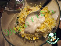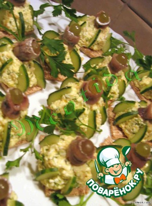 на хрустящей основе из хлебцов разместились наши паучки.. брюшко - остренький салатик из сыра, яблочка, чесночка, яйца, укропа и Вашей любимой заправки..