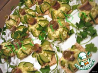 Каждый хлебец ломаем на три равных прямоугольничка, из салатика формируем небольшие шарики и укладываем на хлебцы. |