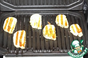 Ломтики сыра халуми обжарить на гриле, сковороде-гриль или просто на сухой сковороде