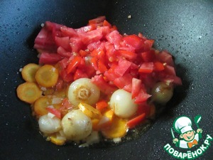 Помидоры мелко нарезать и добавить к овощам. Перемешать.