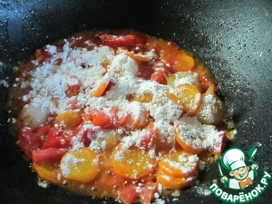 Как только помидоры хорошо пустят сок, всыпать муку и перемешать.