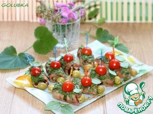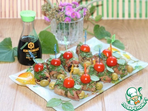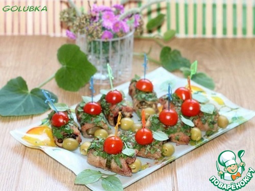 Обжаренные трубочки выкладываем на бумажное полотенце. Затем смазываем трубочки сверху кетчупом, макаем в порубленную зелень и выкладываем на сервировочное блюдо. Украшаем половинками черри и оливками.