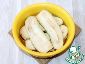 6. Из миски с баклажаном сливаем воду. Пластины баклажана выкладываем на бумажное полотенце, чтобы впитало остатки воды.