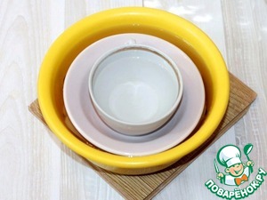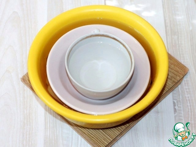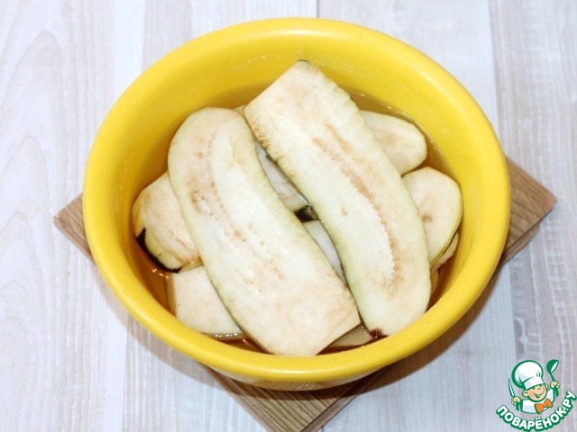 2. Смешать 0,5-0,7 литра воды с 1 ст. ложкой соли и вылить в миску с баклажаном. Накрыть миску тарелкой и поставить "гнет". Оставить миску в сторону на 30 минут.