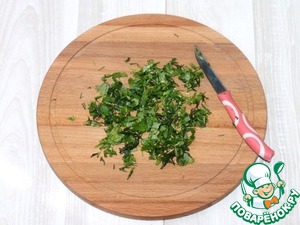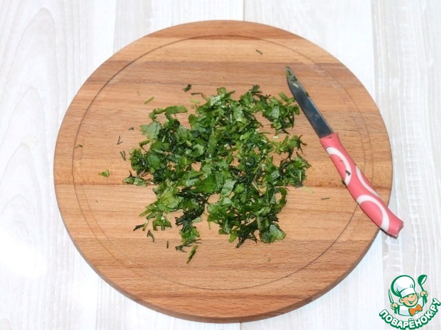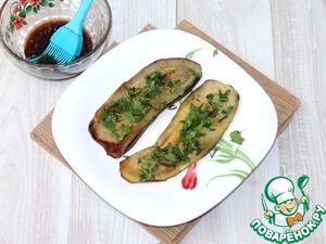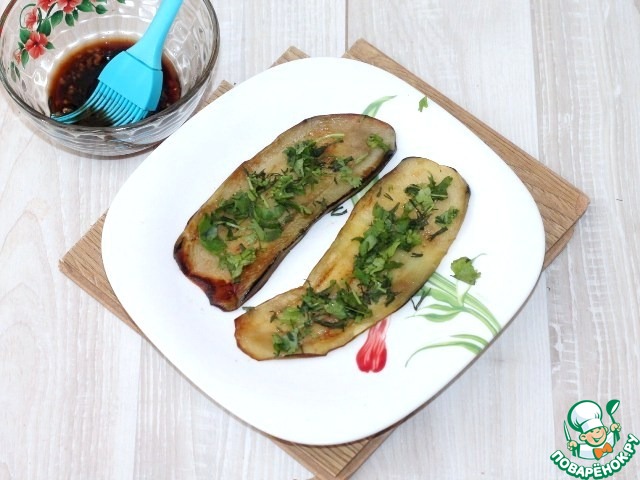 7. Смазываем пластины баклажана соусом и посыпаем зеленью.