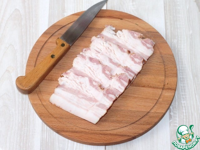 4. Нарезаем грудинку тонкими пластинами (9 шт). А лучше купить грудинку или бекон пластинами.