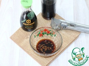 5. Приготовим соус для баклажан. Смешиваем соевый соус, уксус и прессованный чеснок.