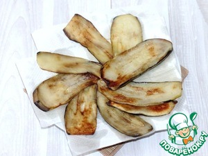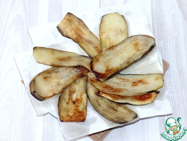 На разогретом растительном масле обжариваем пластины баклажана. Выкладываем их на бумажное полотенце, чтобы впитало излишки масла.