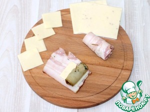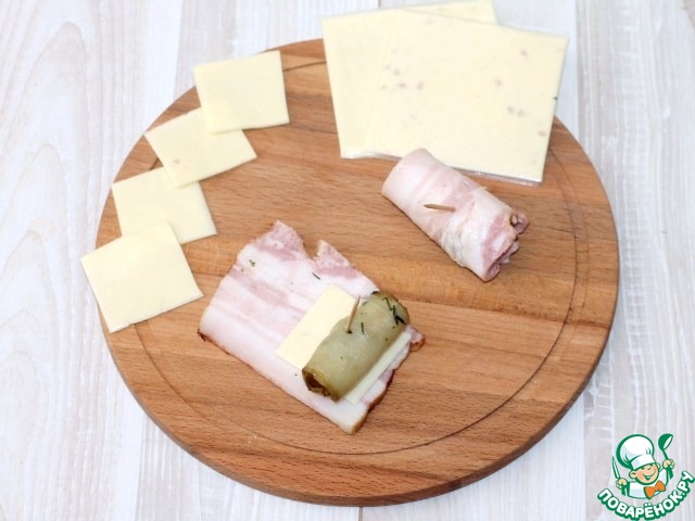 9. На каждый кусочек грудинки кладем 1/4 пластины сыра, затем баклажан и сворачиваем в трубочку. Чтобы сохранить целостность трубочки, можно завязать ее пером зеленого лука.