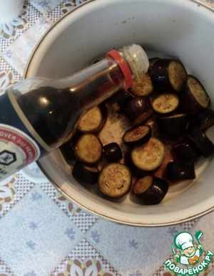 Баклажаны режем кусочками, солим, оставляем минут на 20 (для тошо, чтобы ушла горечь). Затем промываем водой, добавляем соевый соус, соль и все приправы.