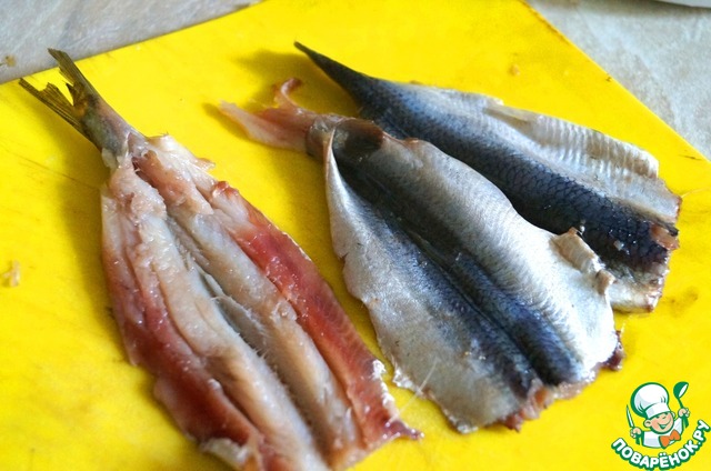 Разрезать рыбок по брюшку, вынуть внутренности. Развернуть и распластать, вытащить хребет, оставив немного в хвостовой части, для цельности. Подготовленную рыбу слегка посолить. |