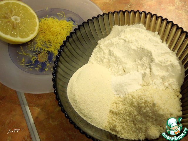 В отдельной миске смешать сухие ингредиенты: пшеничную и миндальную муку, манную крупу и разрыхлитель. Натереть цедру с лимона.