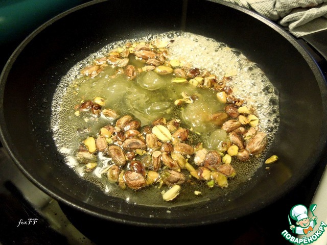 Тем временем приготовить заливку: 150 г фисташек (часть из них немного порубить, часть оставить целыми) прогреть на сковороде, добавить 100 мл меда и довести до кипения. У меня был только плотный мед, он тоже отлично подошел.