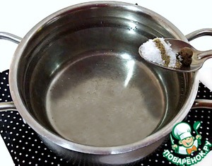 Вскипятить воду, добавить специи по вкусу, душистый перец и лавровый лист (я забыла добавить на фото).