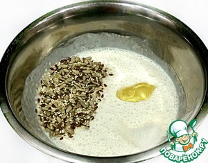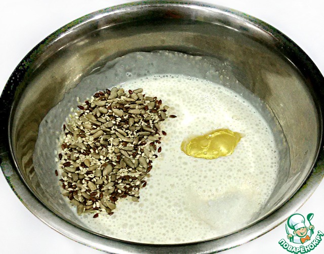 Добавить растительное масло, соль и зерновую смесь из кунжута, семена льна и семена подсолнуха. Так же можно использовать любые зерна, что у Вас есть.