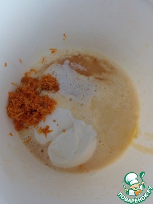 Яйцо не много взбить с сахаром, добавить сметану, соду, растопленное масло, ванильный сахар и цедру. Хорошо перемешать.