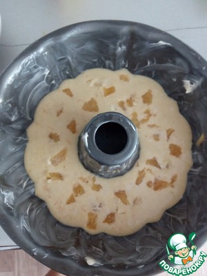 Часть теста выливаем на дно формы для выпечки, смазанной сливочным маслом, пересыпаем нарезанной мякотью апельсина и заливаем все оставшимся тестом. Выпекаем в духовке при 180 градусах до сухой спички, около 30 минут.