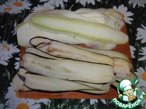 Кабачок и баклажаны режем овощечисткой на тонкие пластины.