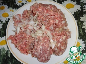 Фарш ( у меня смешанный), солим, перчим и добавляем нарезанный репчатый лук.