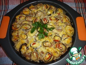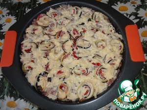 В форму для запекания укладываем Розочки, а между ними фарш (заодно фарш скрепил края цветочков чтоб не раскручивались).