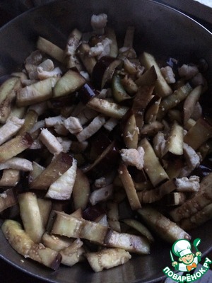 • Разогреть и обжарить куриное филе. Затем добавить баклажаны и жарить смесь на сильном огне, всё время помешивая,10 минут.